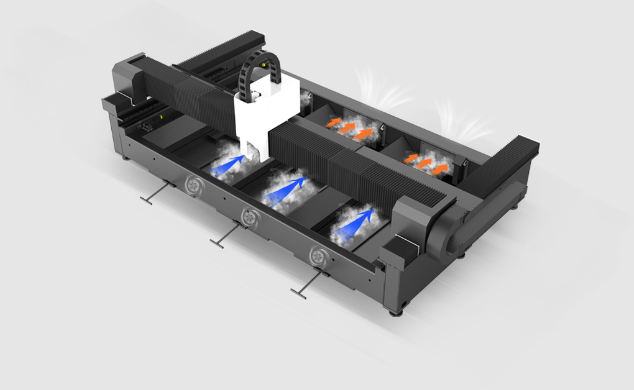 The machine adopts an advanced smoke exhaust system using two blowing and one suction segments. This segmented method delivers improved smoke extraction efficiency for cleaner operation